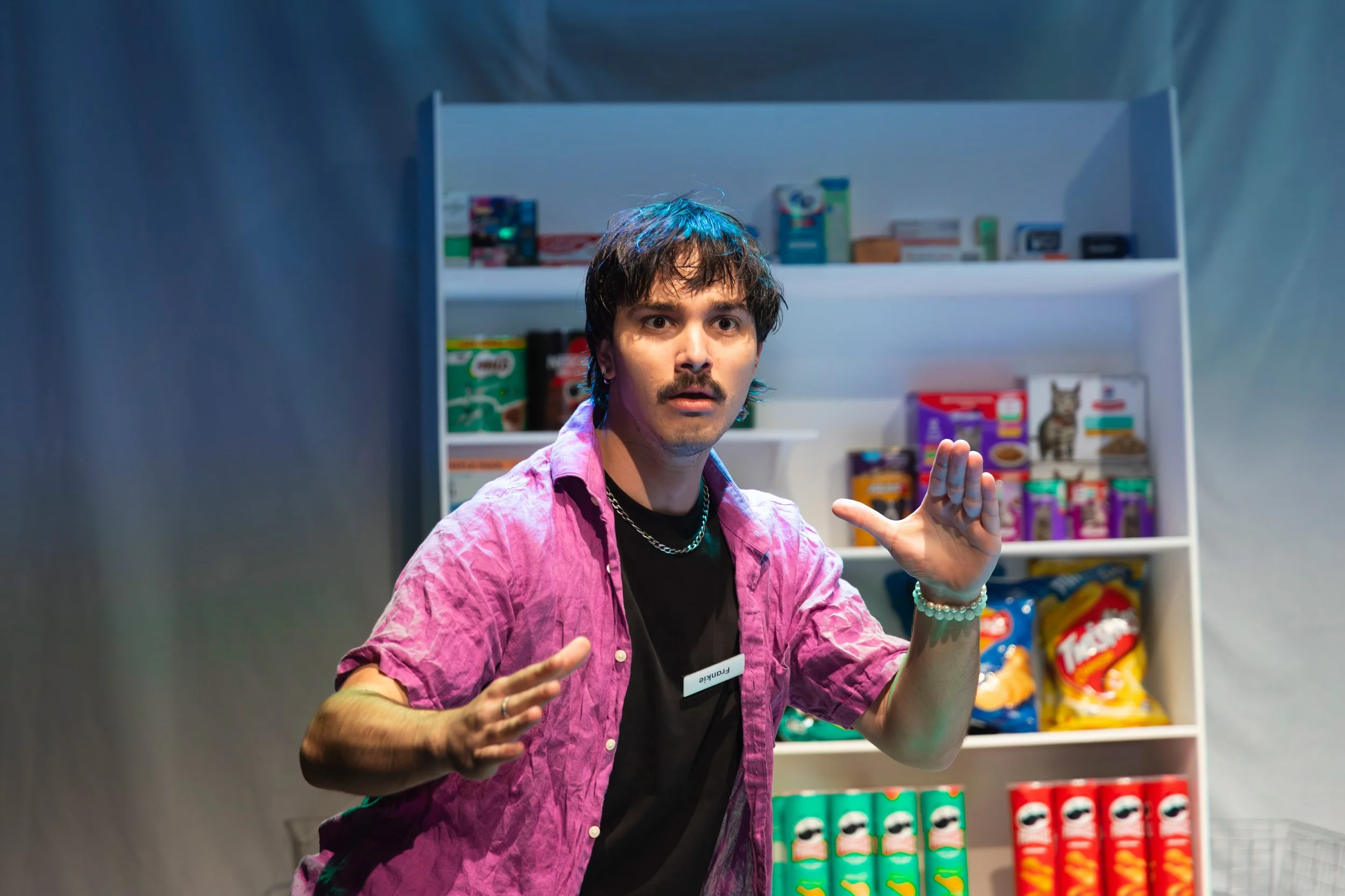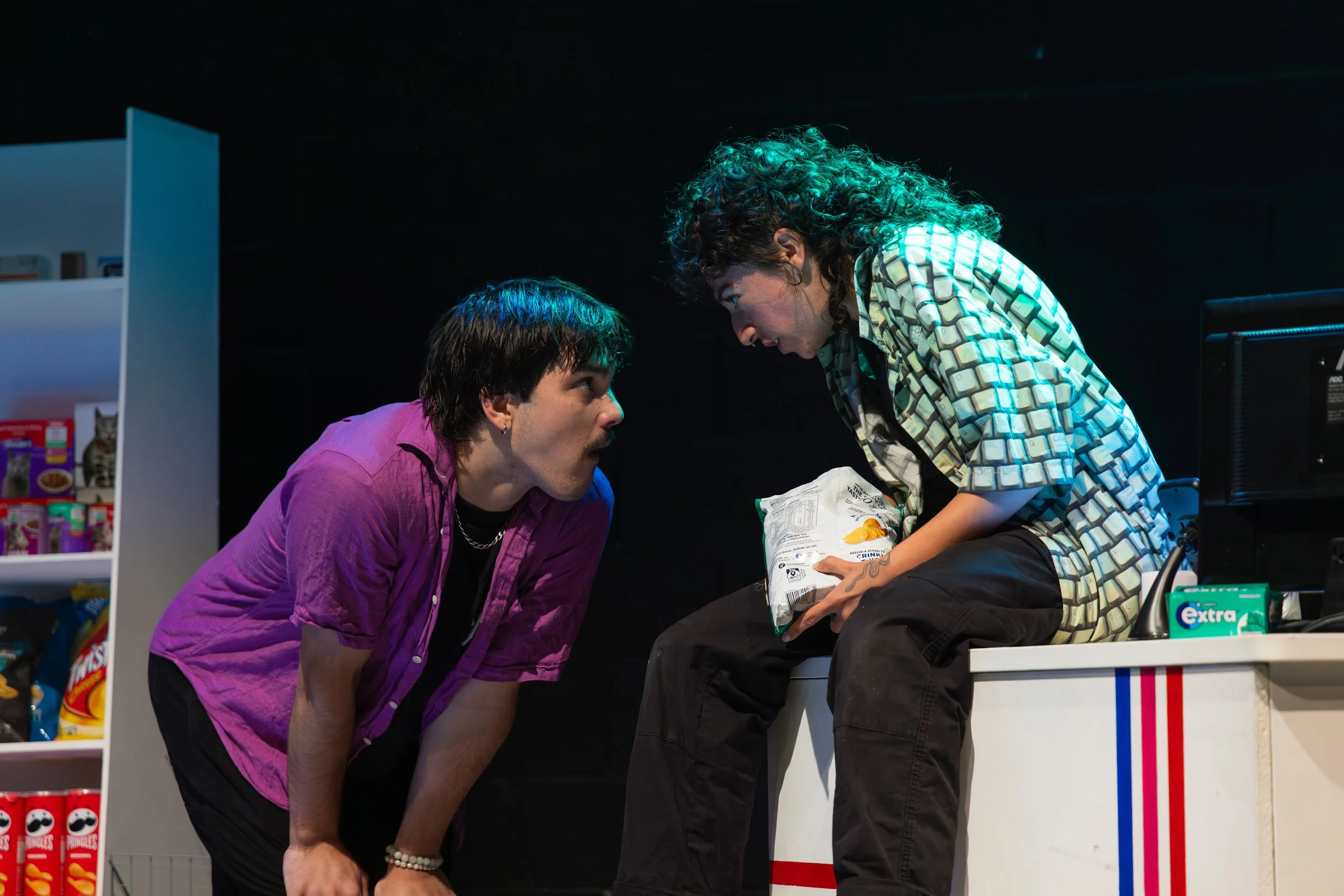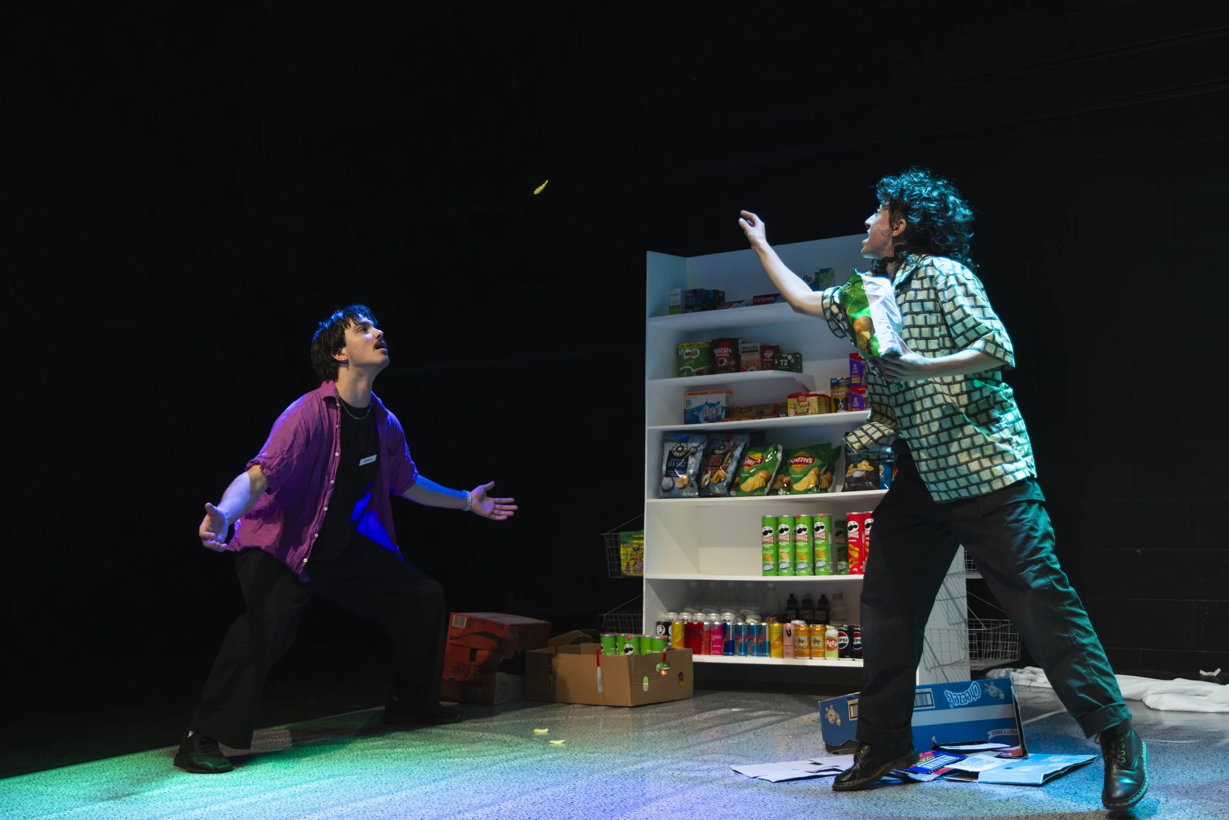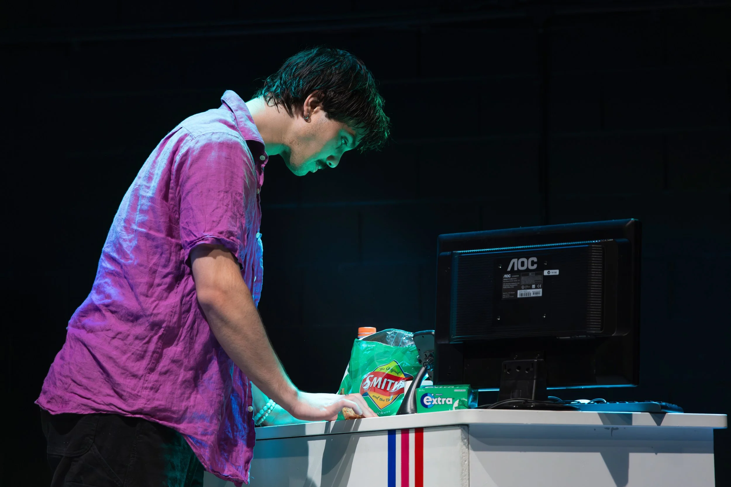 This show’s set consisted of a plain white and naturalistic build, setting the scene for the interior of a petrol station night shift. For most of the show, my goal was to create a cool-toned and unnervingly bland lighting state that would hold the tension in the air as the pair argued. Undercut with occasional purposeful LED flickering baked into the program and executed in coordination with Jakob Schuster’s sound design, this plain and all-illuminating state made up the majority of the show.